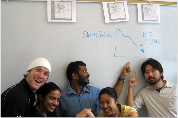 さて結果から述べると、6チーム中6位。株価は当初の34ドルから、10ドル、3ドル、1ドル、3ドル、1ドル・・・・を繰り返し、7年目は1ドル。最後の8年目ではじめての利益を計上し、ようやく31ドルまで戻し、今までの落ち込みが反転して一気にHappyな気分になれたのが救いでした。